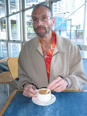 Sunday, 6 April 2003 - (28 KB) Tom stirs his white coffee at the Shark Café, wondering when he's going to get breakfast |