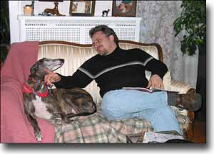 Then after three months with us, in August, Tom and I decided to bring home SurfRider and Kimba. In retrospect I need to say I'm sorry to you because you LOVED being the only greyhound in our house of three dogs. Not that things got bad, it's just that I can see now that you enjoyed leaving behind the issues of pecking order you had at the kennel. Now Kimba was in the house, Kimba who had always been queen at the kennel. Though you were always on the same wavelength with her I think there was a little part of you that knew that you could never quite forget that the rules to live by were Kimba's. Conversely you put SurfRider in his place and he had to live by your rules. Sometimes when you and Kimba put your minds to it young Surf really felt low. Yes Knight, sometimes you could be a spiteful girl and you did sometimes torture Surf.