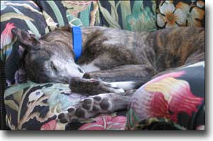 I remember that during those first few months when you were the only greyhound we had a settee in the living room. You loved laying in that settee and were quite the regal and aristocratic queen. The fabric covering that settee was old and didn't hold up too long though, and I'm sorry that I never got around to finishing redoing it for you. I'll have to finish it now because it'll make me smile to think of you.